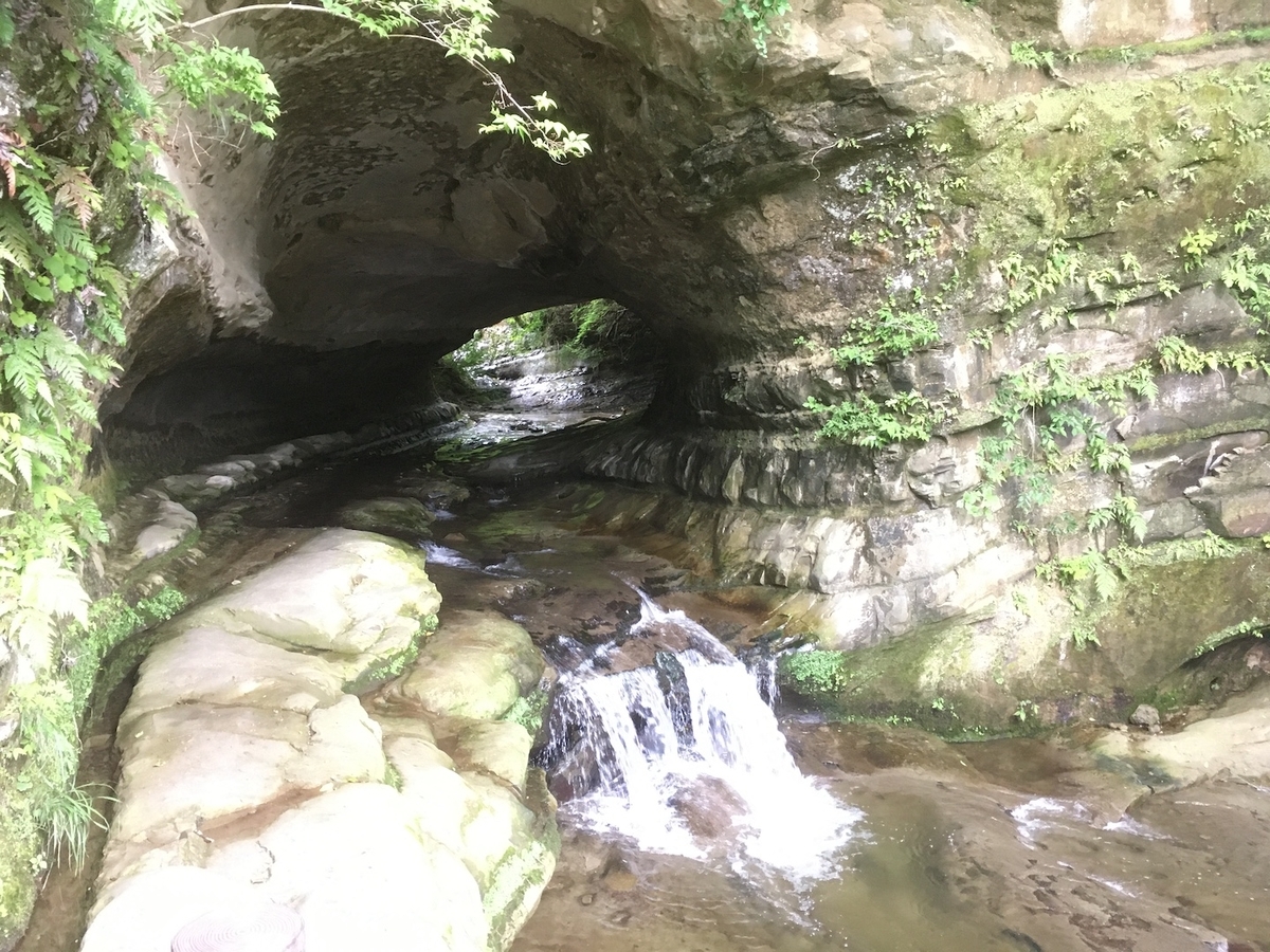 ここ喜楽里の奥の第二駐車場の先に断崖の地層と洞窟の滝(遠見の滝)も見どころの一つです。